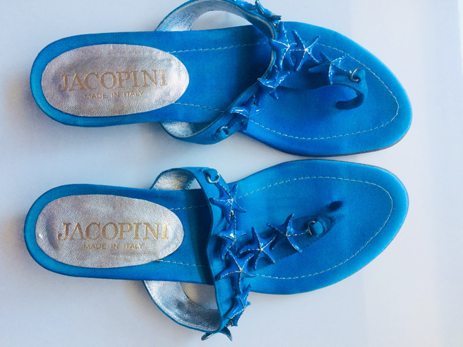 Sandales made in Italy, toutes en cuir (daim), faites à la main. Première en tissu soyeux. Petits talons étoiles de mer en métal peint. Portées une fois pour un mariage. Prix de vente 150€ chez un créateur italien. 37 italien donc ok pour 37,5