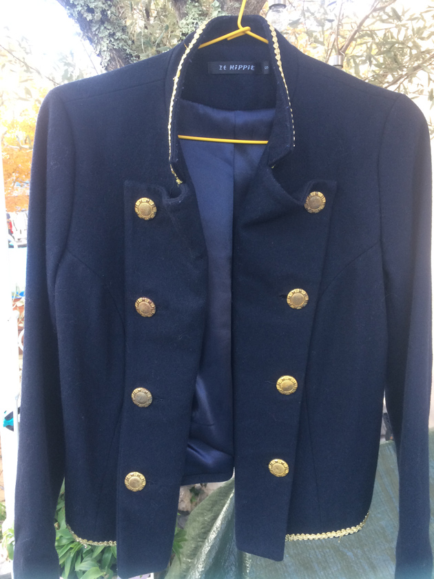 Veste officier de la marque It hippie TS (36/38/ok petit 40) que j’ai customisée avec des boutons vintages et du galon doré. Pièce unique donc…